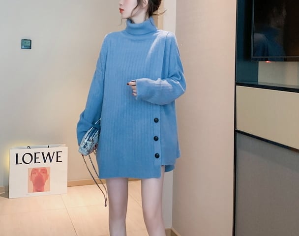 【送料無料】タートルネック ボタン ニット チュニック セーター ハイネック t-98