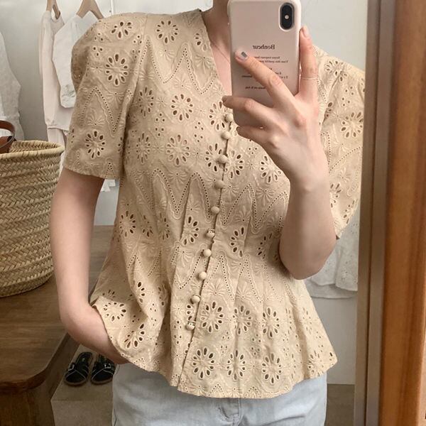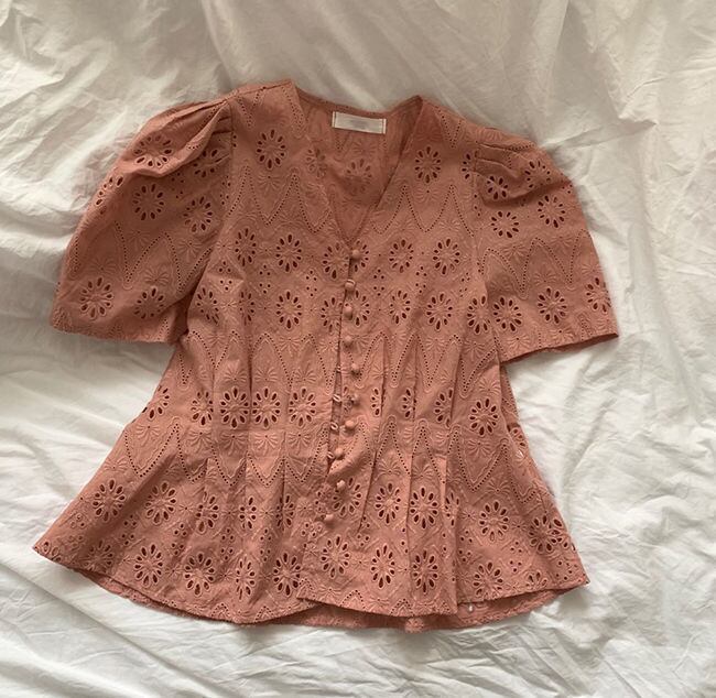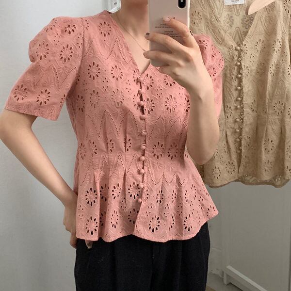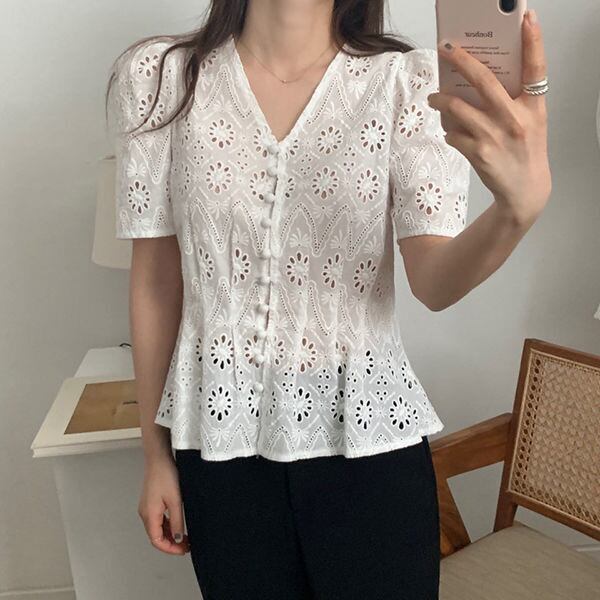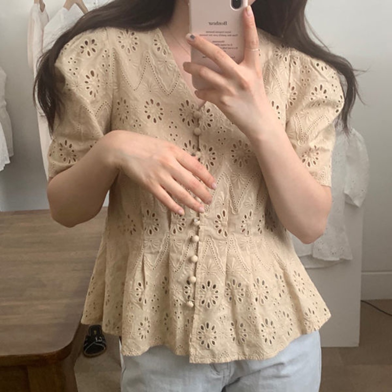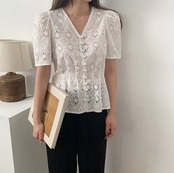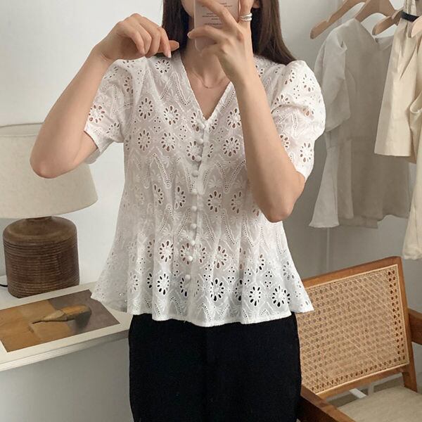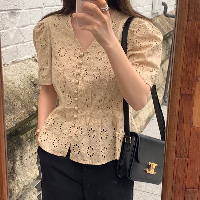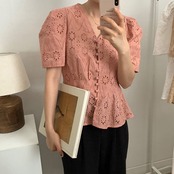 【送料無料】カットワーク レースブラウス パフスリーブ ブラウス シャツ t-346
