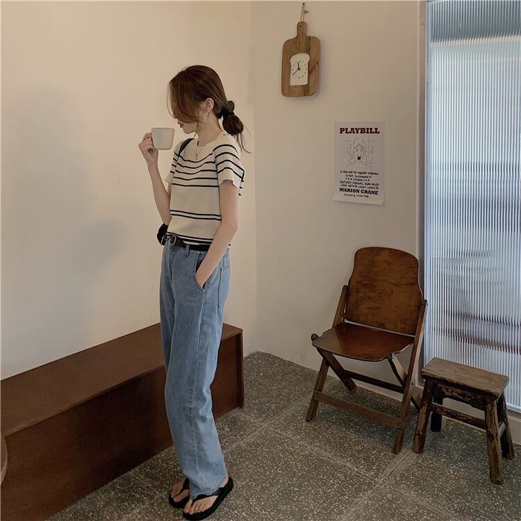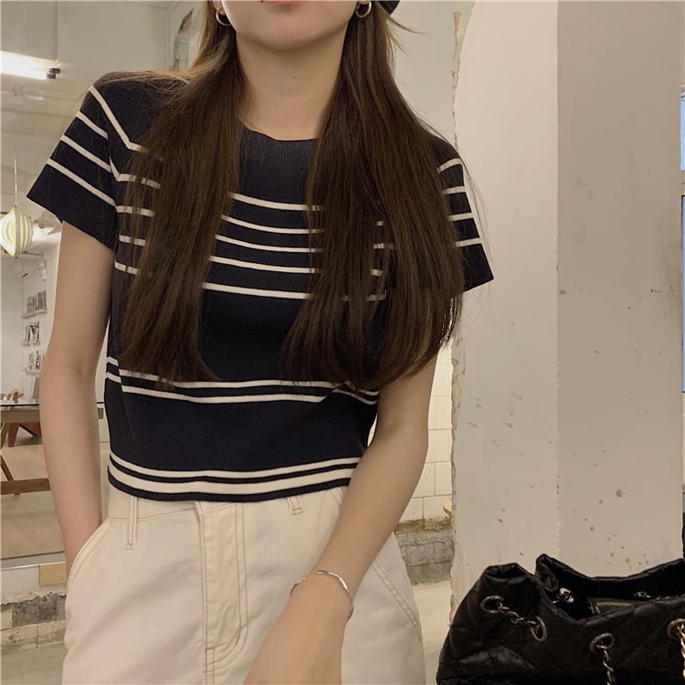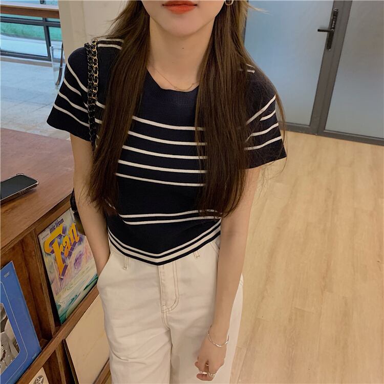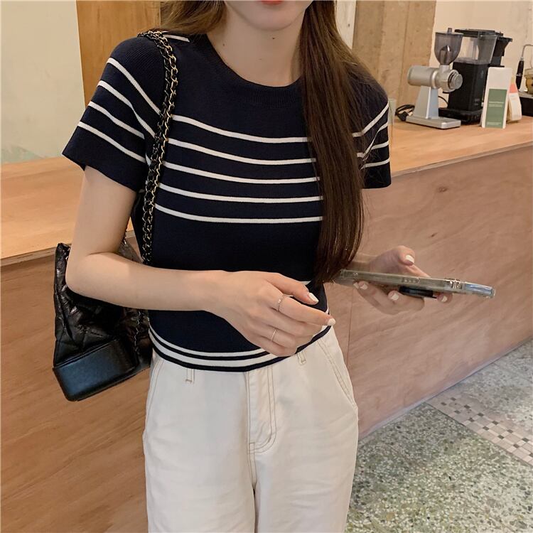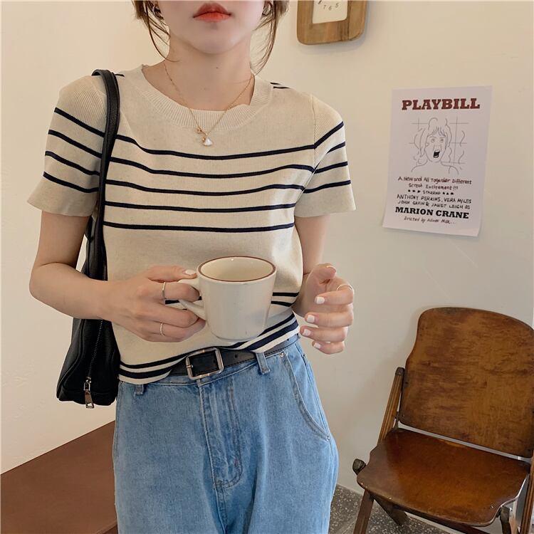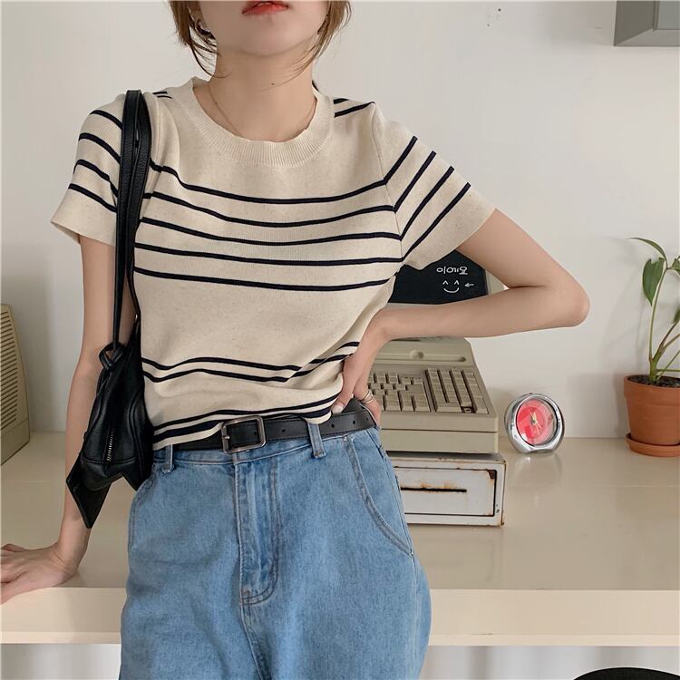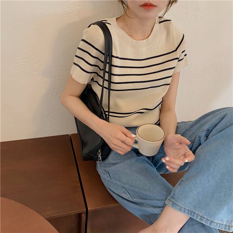 【送料無料】ボーダー カットソー 半袖 ニット ニットソー t-381