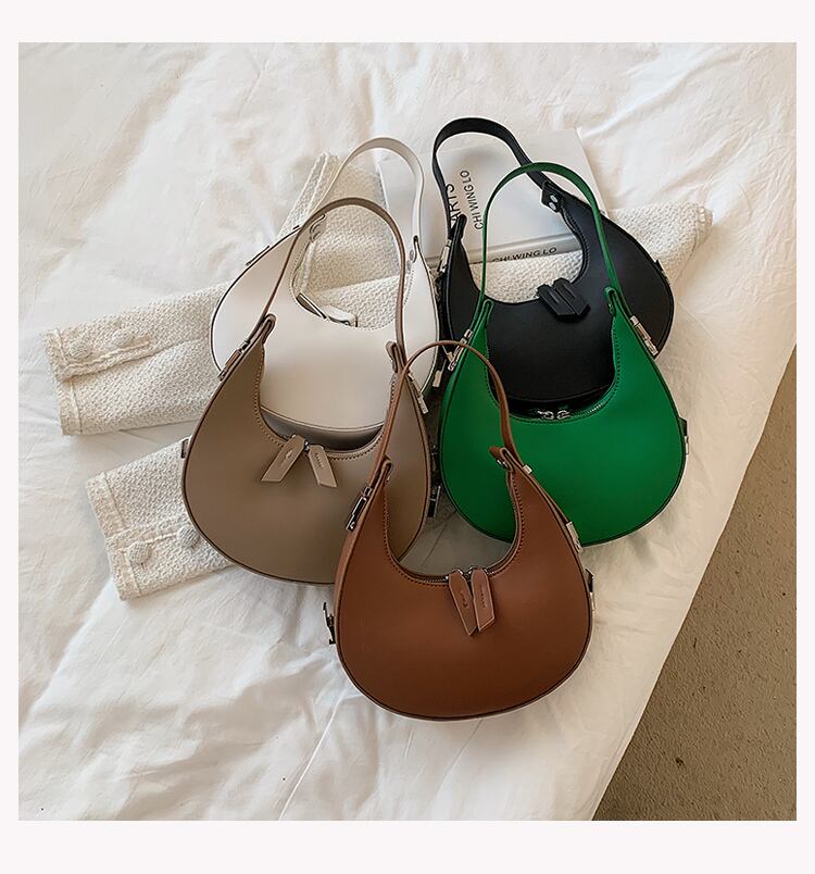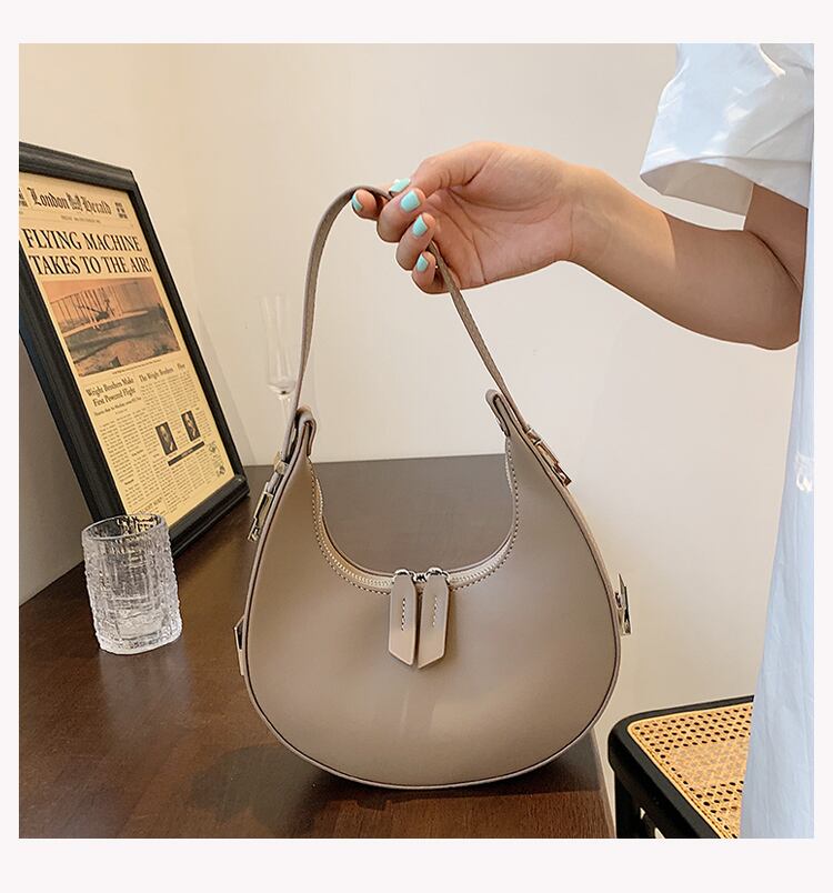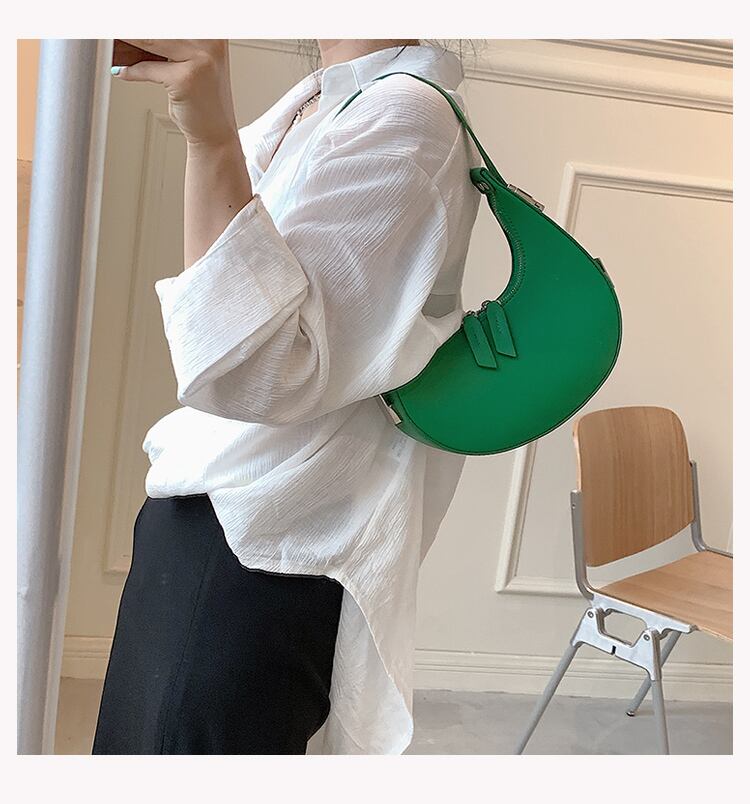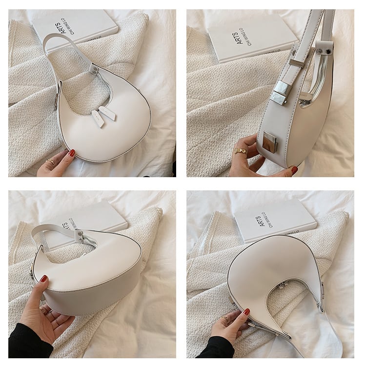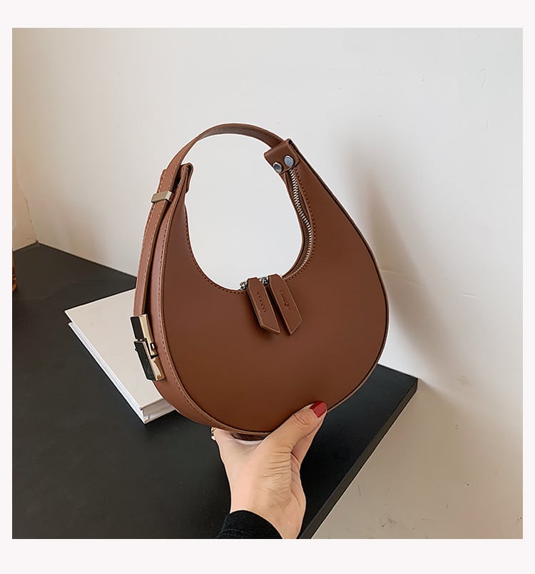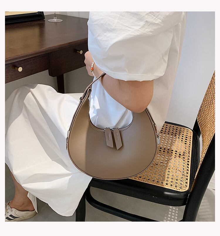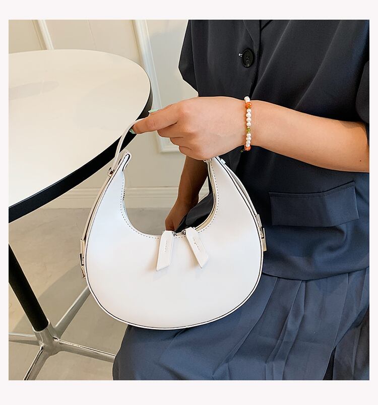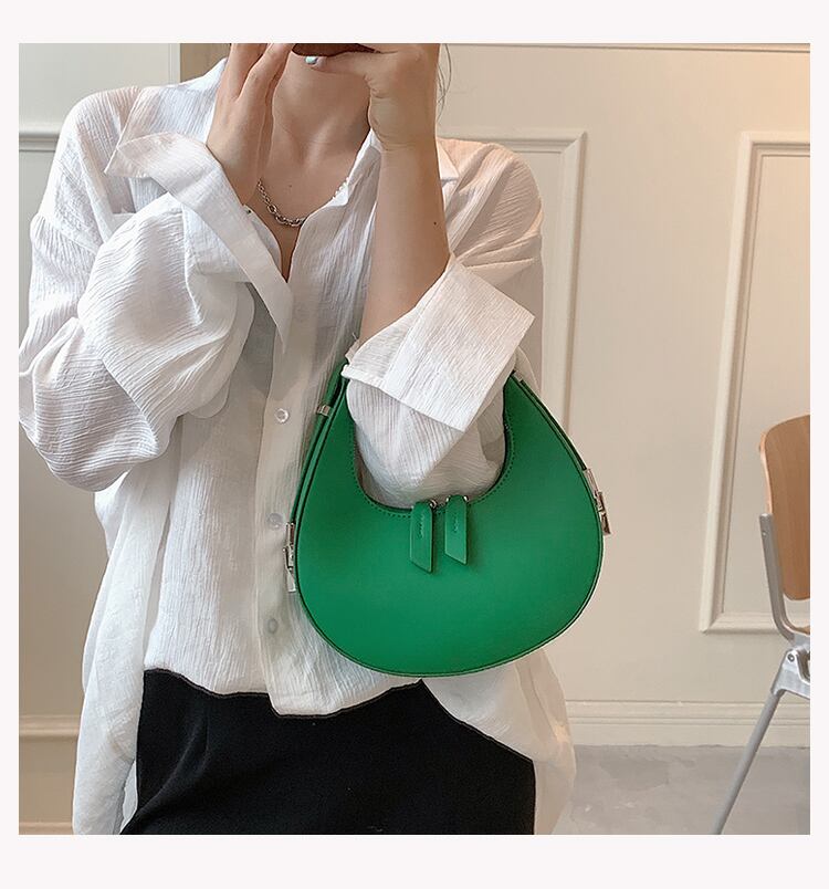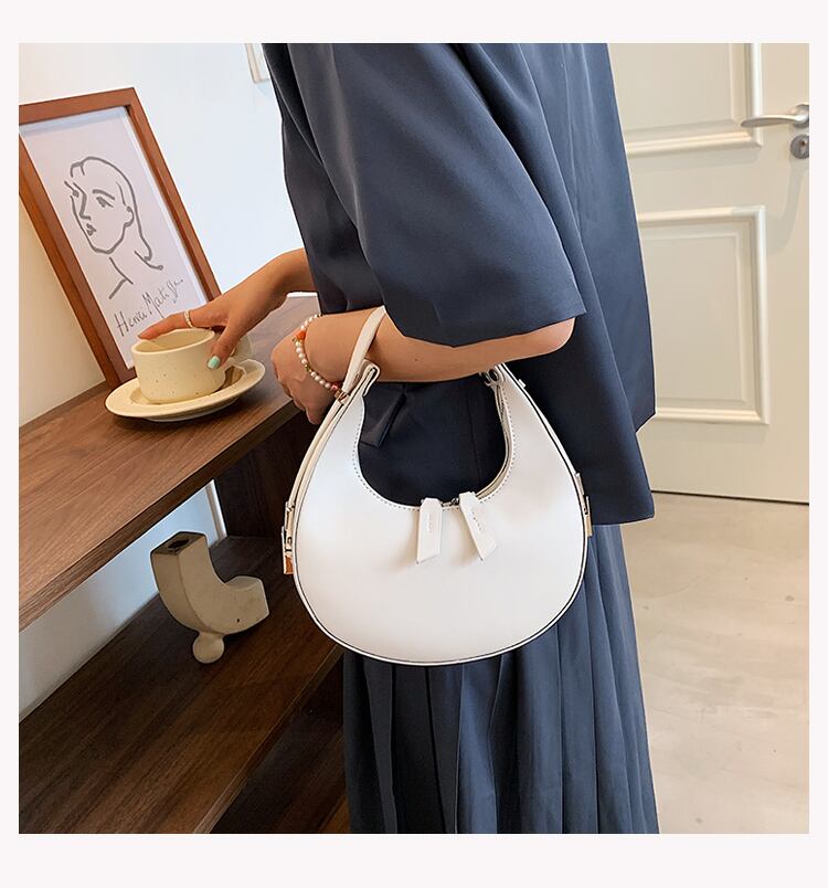 コロンとした三日月型のフォルムが目を引くハンドバッグ